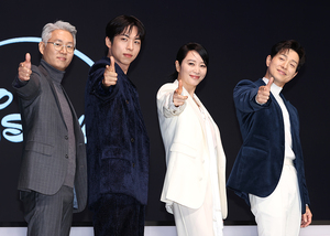 [스포티비뉴스=서울, 곽혜미 기자] 디즈니+ '트리거' 제작발표회가 8일 오전 서울 영등포구 콘래드호텔에서 열렸다. 유선동 감독, 배우 주종혁, 김혜수, 정성일이 포즈를 취하고 있다.