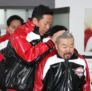 [스포티비뉴스=잠실, 곽혜미 기자] 2025 LG 트윈스 시무식이 8일 오후 서울 송파구 잠실야구장에서 열렸다. LG 퓨처스 이병규 감독이 김용일 코치의 머리를 쓰다듬고 있다.