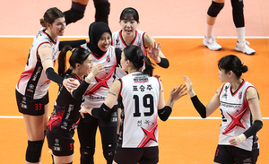 [스포티비뉴스=장충, 곽혜미 기자] 도드람 2024-2025 V리그 여자부 GS칼텍스와 정관장의 경기가 10일 오후 서울 장충체육관에서 열렸다. 정관장 선수들이 득점에 기뻐하고 있다.