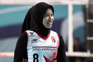[스포티비뉴스=장충, 곽혜미 기자] 도드람 2024-2025 V리그 여자부 GS칼텍스와 정관장의 경기가 10일 오후 서울 장충체육관에서 열렸다. 정관장 메가가 경기를 펼치고 있다.