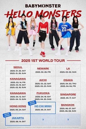 소속사 YG엔터테인먼트는 13일 공식 블로그에 '2025 베이비몬스터 퍼스트 월드투어 '헬로 몬스터즈' 인 아시아' 포스터를 게재하고 추가 지역을 공개했다. 이에 따르면 베이비몬스터는 오는 5월 31일 베트남 호찌민 1회, 6월 14일 인도네시아 자카르타 1회 총 2회 공연을 진행한다.김