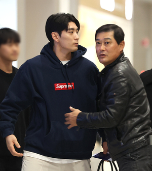 [스포티비뉴스=인천국제공항, 곽혜미 기자] 샌프란시스코 이정후가 메이저리그 두 번째 시즌 준비를 위해 13일 오후 인천국제공항을 통해 미국으로 출국하며 아버지 이종범 코치와 인사를 하고 있다.