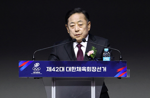 [스포티비뉴스=방이동, 곽혜미 기자] 제42대 대한체육회장 선거가 14일 오후 서울 송파구 방이동 올림픽공원 올림픽홀에서 열렸다. 김용주 후보자가 정견 발표를 하고 있다.