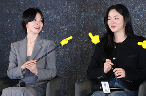 [스포티비뉴스=서울, 곽혜미 기자] 영화 '검은수녀들' 오픈 쇼케이스가 14일 오후 서울 송파구 잠실 롯데시네마 월드타워점에서 열렸다. 배우 송혜교, 전여빈이 서로를 지목하고 있다.