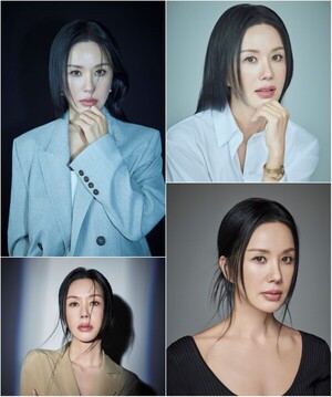 또 다른 프로필에서는 엄정화의 도회적인 세련미가 가감 없이 드러나 이목을 집중시킨다. 베이지의 모던하고 심플한 상의를 매치한 컷에서는 어두운 배경 속 스포트라이트를 받으며 고혹적인 자태를 뽐내고, 블루 캐주얼 수트에서는 스타일링에 어울리는 자연스러운 포즈로 시크한 카리스마를 뿜어낸다.