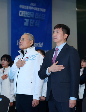 [스포티비뉴스=방이동, 곽혜미 기자] 2025 하얼빈 동계아시안게임 대한민국 선수단 결단식이 24일 오후 서울 송파구 방이동 올림픽파크텔 올림피아홀에서 열렸다. 유인촌 문화체육부 장관, 유승민 대한체육회장 당선인이 국기에 대한 경례를 하고 있다.