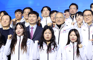 [스포티비뉴스=방이동, 곽혜미 기자] 2025 하얼빈 동계아시안게임 대한민국 선수단 결단식이 24일 오후 서울 송파구 방이동 올림픽파크텔 올림피아홀에서 열렸다. 유승민 대한체육회장 당선인, 유인촌 문화체육부 장관이 선수단과 함께 파이팅을 외치고 있다.