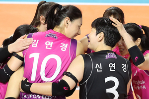 [스포티비뉴스=인천, 곽혜미 기자] 도드람 2024-2025 V리그 여자부 흥국생명과 현대건설의 경기가 25일 오후 인천삼산월드체육관에서 열렸다. 흥국생명 김연경과 신연경이 기뻐하고 있다.