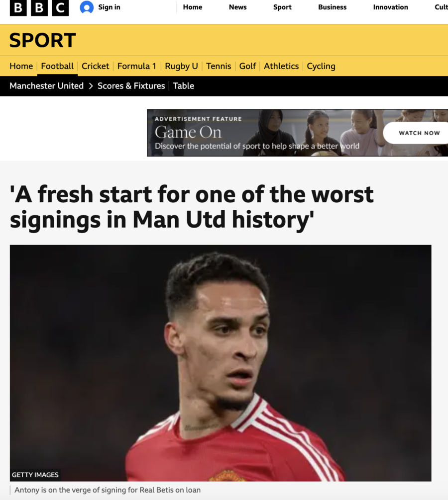 영국 공영방송 ‘BBC’는 25일(한국시간) “150년에 가까운 역사를 가진 맨체스터 유나이티드가 역사상 최악의 영입을 논할 때, 브라질 출신의 윙어 안토니 이름이 거론될 것이다. 맨체스터 유나이티드는 안토니를 프리메라리가 팀 레알 베티스 임대 보내기를 결정했다. 안토니의 주급 84%를 부담하는 조건으로 계약을 체결했다”라고 보도했다.