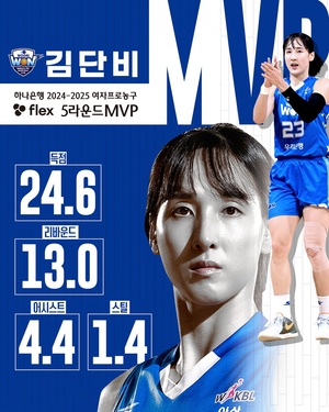 WKBL(한국여자프로농구)은 7일 하나은행 2024-2025 여자프로농구 flex 5라운드 MVP(최우수선수)에 김단비(35, 180cm)가 선정됐다고 발표했다.