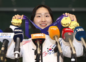 [스포티비뉴스=인천국제공항, 곽혜미 기자] 2025 하얼빈 동계 아시안게임에서 역대 최고 성적을 거둔 대한민국 쇼트트랙 대표팀이 10일 오후 인천국제공항을 통해 귀국했다. 최민정이 금메달을 들고 기념 촬영을 하고 있다.