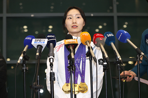 [스포티비뉴스=인천국제공항, 곽혜미 기자] 2025 하얼빈 동계 아시안게임에서 역대 최고 성적을 거둔 대한민국 쇼트트랙 대표팀이 10일 오후 인천국제공항을 통해 귀국했다. 최민정이 인터뷰를 하고 있다.
