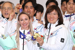 [스포티비뉴스=인천국제공항, 곽혜미 기자] 2025 하얼빈 동계 아시안게임 대한민국 선수단 귀국 환영 행사가 15일 오후 인천국제공항에서 진행됐다. 바이애슬론 압바꾸모바가 장미란 차관과 기념 촬영을 하고 있다 .