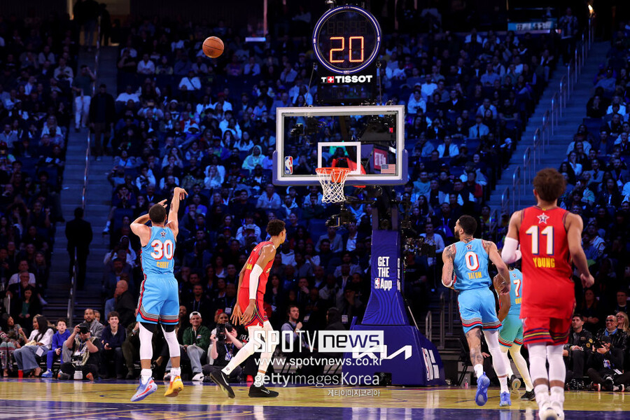 커리는 크게 힘을 들이지 않고 먼 거리에서 3점슛을 시도했고, 그 공이 림 가운데를 정확히 통과했다. 커리의 소속팀 골든스테이트의 홈구장인 체이스 센터를 가득 메운 팬들은 환호성을 질러댔다.