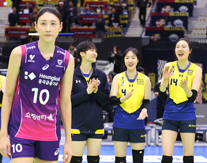 [스포티비뉴스=인천, 곽혜미 기자] 도드람 2024-2025 V리그 여자부 현대건설과 흥국생명의 경기가 21일 오후 경기도 수원체육관에서 열렸다. 경기 종료 후 흥국생명 은퇴 투어 행사에서 현대건설 양효진이 김연경을 향해 박수를 보내고 있다.