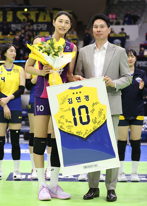 [스포티비뉴스=인천, 곽혜미 기자] 도드람 2024-2025 V리그 여자부 현대건설과 흥국생명의 경기가 21일 오후 경기도 수원체육관에서 열렸다. 경기 종료 후 진행된 흥국생명 김연경의 은퇴 투어 행사. 현대건설 강성형 감독이 김연경과 기념 촬영을 하고 있다.