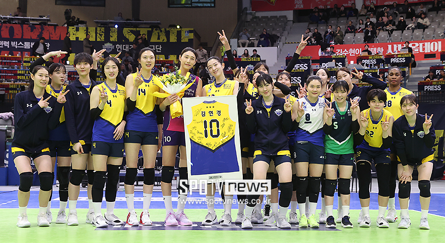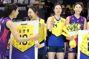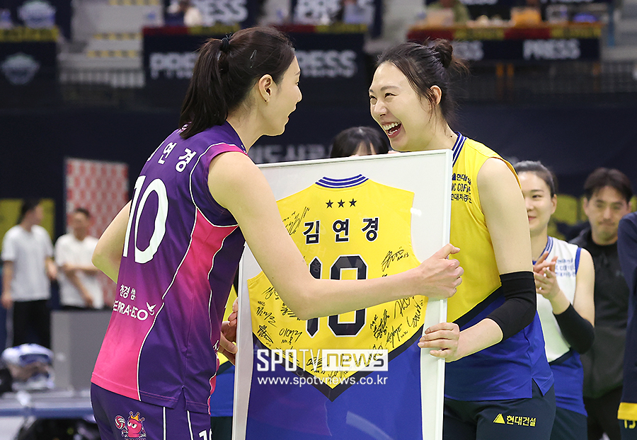 쑥스러운 표정으로 코트에 입장하는 김연경을 보고, 양효진은 크게 웃으며 긴장을 풀어줬다. 국가대표팀에서 오랜 시간 함께했던 '절친' 양효진은 선수단을 대표해, 김연경에게 사인이 새겨진 유니폼 액자를 전달했고 강성형 감독도 김연경에게 꽃다발을 주며 그의 은퇴를 진심으로 축하했다.