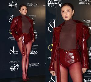 화사는 이날 속이 훤히 비치는 시스루 이너에 강렬한 버건디 레더 크롭 재킷과 숏팬츠를 매치해 볼륨감 넘치는 몸매를 뽐냈다.