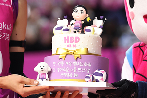 [스포티비뉴스=인천, 곽혜미 기자] 도드람 2024-2025 V리그 여자부 흥국생명과 IBK기업은행의 경기가 25일 오후 인천삼산월드체육관에서 열렸다. 흥국생명 김연경이 경기 종료 후 생일 케이크를 선물 받고 있다.