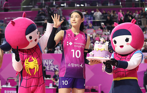 [스포티비뉴스=인천, 곽혜미 기자] 도드람 2024-2025 V리그 여자부 흥국생명과 IBK기업은행의 경기가 25일 오후 인천삼산월드체육관에서 열렸다. 세트 스코어 3-1로 승리한 흥국생명 김연경이 생일 케이크 선물을 받으며 팬들을 바라보고 있다.