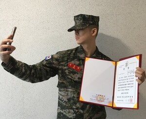 공개된 사진에서 그리는 표창장을 들고 인증샷을 남기고 있다. 표창장에는 '평소 투철한 군인정신과 왕성한 책임감으로 맡은 바 직무에 정려하여 왔으며, 특히 여단본부 시설·환경관리를 훌륭히 수행하여 항상 충실한 청룡포병여단에 기여한 공로가 크므로 이 상장을 수여합니다"라는 문구가 담겼다.