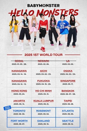 소속사 YG엔터테인먼트에 따르면 베이비몬스터는 오는 8월 30일 토론토, 9월 2일 로즈먼트, 5일 애틀랜타, 7일 포트워스, 10일 오클랜드, 12일 시애틀에서 두 번째 '2025 베이비몬스터 퍼스트 월드투어 '헬로 몬스터즈' 인 노스 아메리카'를 개최한다.