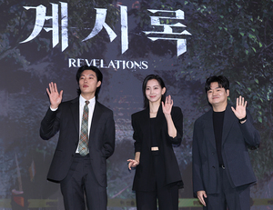 [스포티비뉴스=서울, 곽혜미 기자] 넷플릭스 영화 '계시록' 제작보고회가 18일 오전 서울 마포구 호텔 나루 서울 엠갤러리에서 열렸다. 배우 류준열, 신현빈, 신민재가 포즈를 취하고 있다.