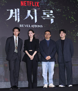 [스포티비뉴스=서울, 곽혜미 기자] 넷플릭스 영화 '계시록' 제작보고회가 18일 오전 서울 마포구 호텔 나루 서울 엠갤러리에서 열렸다. 배우 류준열, 신현빈, 연상호 감독, 신민재가 포즈를 취하고 있다.
