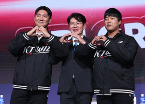 [스포티비뉴스=잠실, 곽혜미 기자] 2025 신한 SOL Bank KBO 미디어데이가 20일 오후 서울 송파구 잠실동 롯데호텔 월드에서 열렸다. KT 장성우, 이강철 감독, 강백호가 포즈를 취하고 있다.