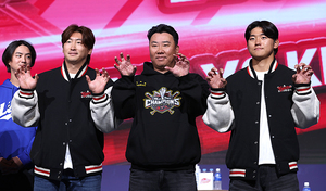 [스포티비뉴스=잠실, 곽혜미 기자] 2025 신한 SOL Bank KBO 미디어데이가 20일 오후 서울 송파구 잠실동 롯데호텔 월드에서 열렸다. KIA 나성범, 이범호 감독, 김도영이 포즈를 취하고 있다.