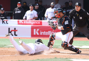 [스포티비뉴스=수원, 곽혜미 기자] 2025 신한 SOL Bank KBO리그 KT 위즈와 한화 이글스의 경기가 22일 오후 수원 KT위즈파크에서 열렸다. 2회말 1사 3루 KT 배정대의 희생플라이 때 3루 주자 문상철이 득점에 성공하고 있다.