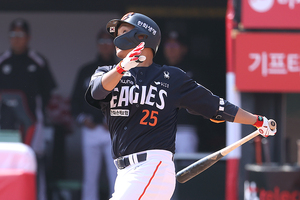 [스포티비뉴스=수원, 곽혜미 기자] 2025 신한 SOL Bank KBO리그 KT 위즈와 한화 이글스의 경기가 22일 오후 수원 KT위즈파크에서 열렸다. 3회초 2사 2루 상황에서 한화 김태연이 1타점 적시타를 날리고 있다.