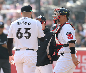 [스포티비뉴스=수원, 곽혜미 기자] 2025 신한 SOL Bank KBO리그 KT 위즈와 한화 이글스의 경기가 22일 오후 수원 KT위즈파크에서 열렸다. 5회초 KT 선발 헤이수스가 장성우와 대화를 하고 있다.