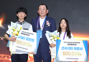 [스포티비뉴스=방이동, 곽혜미 기자] 대한바이애슬론연맹의 '2025 동계아시안게임 포상금 수여식 및 바이애슬론의 밤'이 9일 오후 서울 송파구 방이동 서울올림픽파크텔에서 열렸다. 페어플레이상을 받은 황지중 김탄탄, 서울행현초 이은서가 이혁렬 회장과 기념 촬영을 하고 있다.