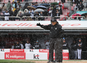[스포티비뉴스=수원, 곽혜미 기자] 2025 신한 SOL Bank KBO리그 KT 위즈와 삼성 라이온즈의 경기가 13일 오후 수원 KT위즈파크에서 열렸다. 우박으로 경기가 중단되고 있다.