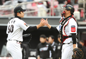 [스포티비뉴스=수원, 곽혜미 기자] 2025 신한 SOL Bank KBO리그 KT 위즈와 삼성 라이온즈의 경기가 13일 오후 수원 KT위즈파크에서 열렸다. 6-5 승리를 지킨 KT 박영현, 장성우가 하이파이브를 하고 있다.