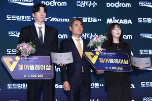 [스포티비뉴스=홍은동, 곽혜미 기자] 2024-2025 V리그 시상식이 14일 오후 서울 서대문구 홍은동 스위스 그랜드 호텔에서 열렸다. 페어플레이상을 수상한 현대캐피탈을 대표해 허수봉, IBK기업은행을 대표한 황민경이 기념 촬영을 하고 있다.