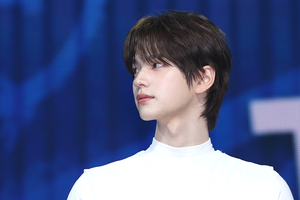 [스포티비뉴스=서울, 곽혜미 기자] 투어스 미니 3집 'TRY WITH US(트라이 위드 어스)' 발매 기념 쇼케이스가 21일 오후 서울 용산구 한남동 블루스퀘어에서 열렸다. 투어스 신유가 사회자를 바라보고 있다.