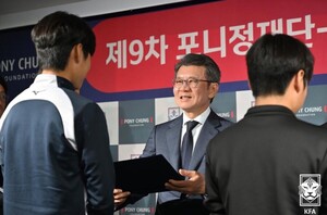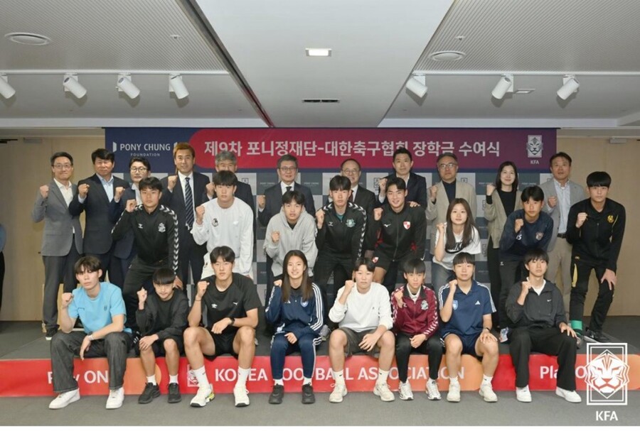 [스포티비뉴스=배정호 기자] 대한축구협회와 포니정재단이 21일 오후 서울 종로구 신문로 축구회관에서 ‘제9차 포니정재단-대한축구협회 장학금 수여식’을 열고, 남녀 중학교 선수 60명에게 장학금을 전달했다.