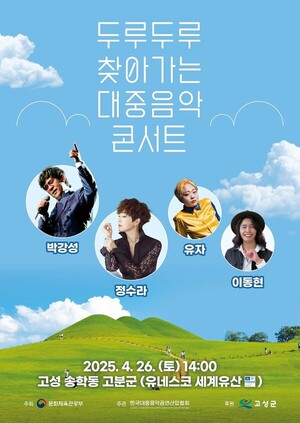㈔한국대중음악공연산업협회(이하 음공협)가 주관하는 ‘두루두루 찾아가는 대중음악 콘서트’가 오는 4월 26일 유네스코 세계유산 경남 고성 송학동 고분군 특설무대에서 열린다.