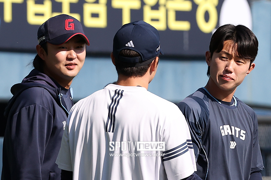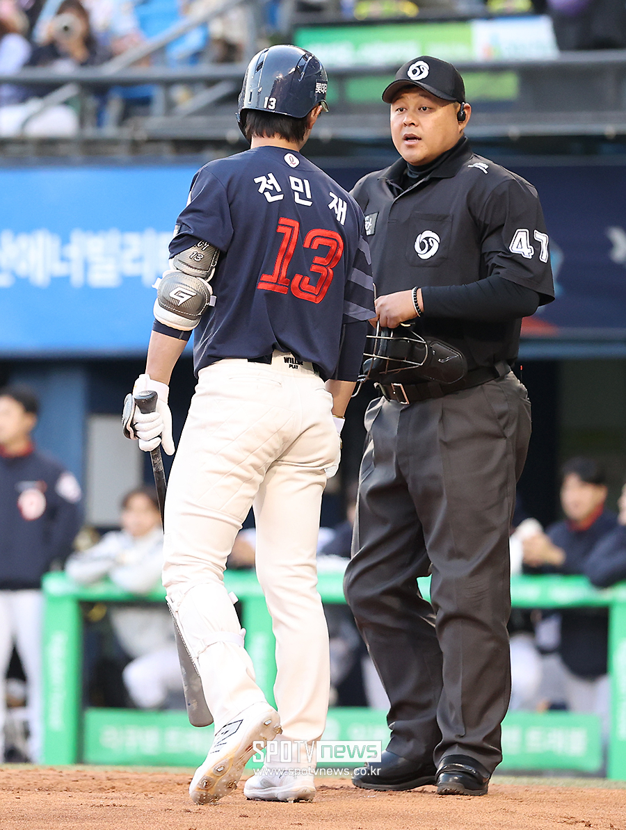 2회초 첫 타석에 들어서기 전 전민재는 최영주 심판과 짧은 대화를 나눴다.