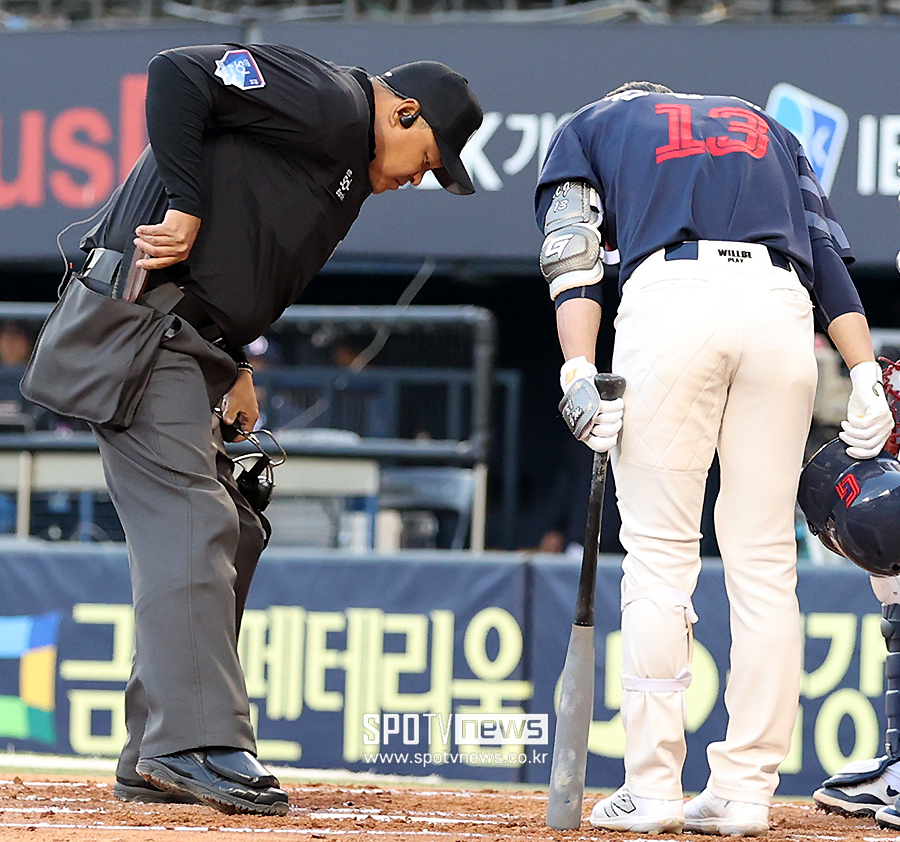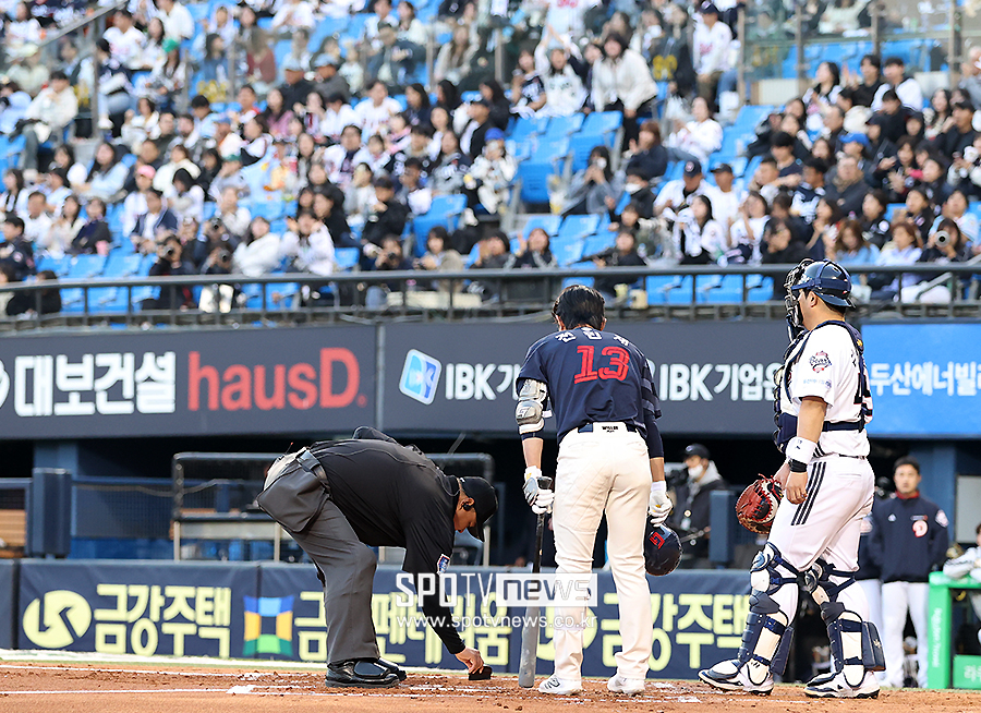 전민재의 수줍은 부탁에 최영주 심판은 조용히 브러시를 꺼내 들었다. 피치클락의 방해 없이 팬들에게 인사할 수 있도록 천천히 홈플레이트를 쓸며 시간을 벌어준 것이다. 덕분에 전민재는 1루 관중석을 향해 인사를 할 수 있었다.