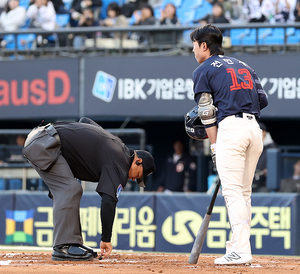홈플레이트 쓸며 전민재의 인사 시간 벌어준 최영주 심판의 따뜻한 배려