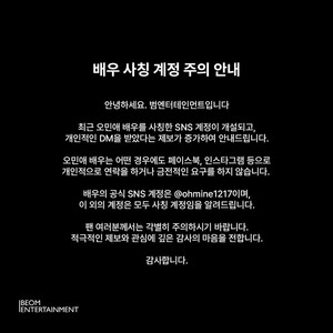 더불어 배우 공식 개정을 재차 알리며 "이 외의 계정은 모두 사칭 계정임을 알려드린다. 팬 여러분께서는 각별히 주의하시기 바란다. 적극적인 제보와 관심에 깊은 감사의 마음을 전한다"고 덧붙여 눈길을 모았다.