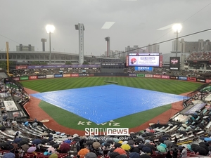 [스포티비뉴스=수원, 윤욱재 기자] 내리는 비를 막을 수 없었다. KT와 롯데의 경기는 결국 더블헤더로 열린다.