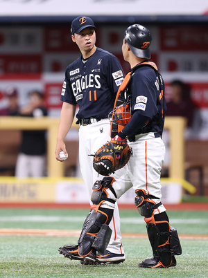 [스포티비뉴스=고척, 곽혜미 기자] 2025 신한 SOL Bank KBO리그 키움 히어로즈와 한화 이글스의 경기가 9일 오후 서울 구로구 고척스카이돔에서 열렸다. 1회말 1사 1루 상황에서 한화 엄상백이 포수 이재원과 대화를 나누고 있다.
