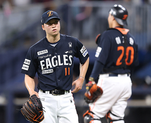 [스포티비뉴스=고척, 곽혜미 기자] 2025 신한 SOL Bank KBO리그 키움 히어로즈와 한화 이글스의 경기가 9일 오후 서울 구로구 고척스카이돔에서 열렸다. 4회말 2사 한화 선발 엄상백이 교체되고 있다.