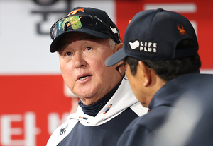 [스포티비뉴스=고척, 곽혜미 기자] 2025 신한 SOL Bank KBO리그 키움 히어로즈와 한화 이글스의 경기가 11일 오후 서울 구로구 고척스카이돔에서 열렸다. 7회말 한화 김경문 감독이 양상문 코치와 대화를 나누고 있다.