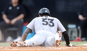 [스포티비뉴스=수원, 곽혜미 기자] 2025 신한 SOL Bank KBO리그 KT 위즈와 KIA 타이거즈의 경기가 20일 오후 수원 KT위즈파크에서 열렸다. 1회말 1사 2,3루 KT 장성우 타석 때 나온 KIA 윤영철의 폭투에 3루 주자 김민혁이 득점을 하고 있다.