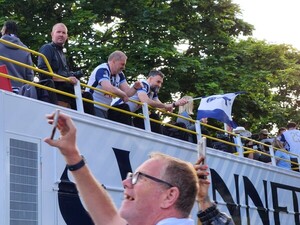 포스테코글루는 버스 퍼레이드에서 계속 손을 흔들며 팬들의 함성에 답했다. 경기장 도착 후 무대에서 이름이 호명되는 상황에서는 손흥민과 미키 판 더 펜 다음으로 가장 많이 환호 받았다.